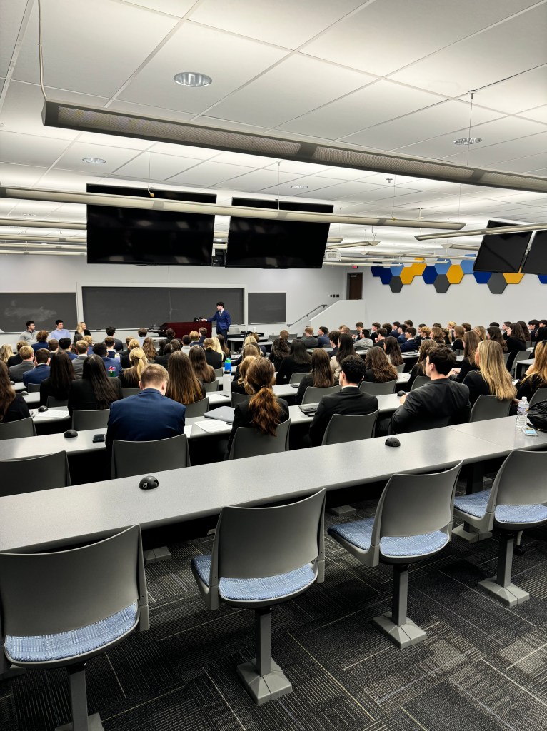 To wrap up the week before interviews, we had our highly anticipated Formal Open House. This is a special event where everyone in the room is dressed in business professional attire and get to hear from a panel of Delta Sigma Pi alumni about their personal experiences with the fraternity, where they ended up after graduation, and any tips they have for interviews. Each student interested in rushing gets to have their résumé reviewed by multiple brothers who have gained so much professional experience so far. This recruitment week was a massive success as we had 72 applicants and were able to walk away with a brand new and exciting pledge class of 26. Keep a look out on our social medias to meet the Fall ‘24 class!